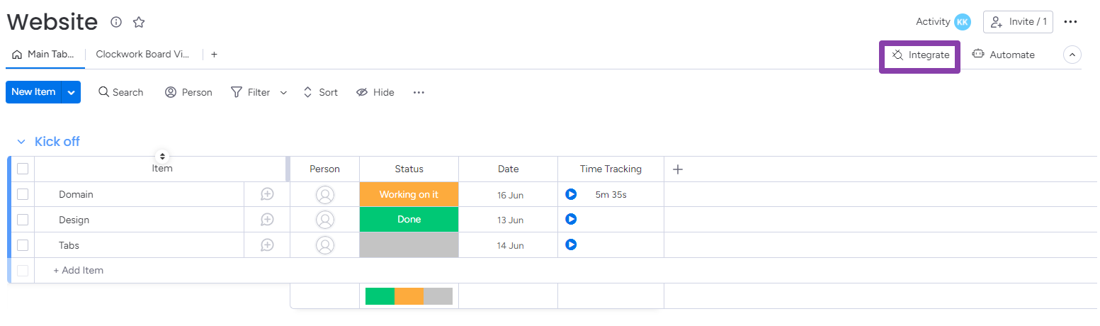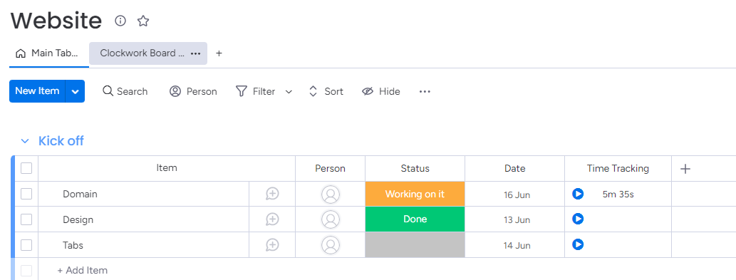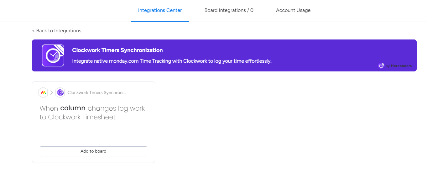 Clockwork allows you to integrate the monday.com native Time Tracking field with your timesheets. Whenever you start and stop the timer by clicking the Time Tracking field on your board, your time will be added to the timesheet in the Clockwork Board view.