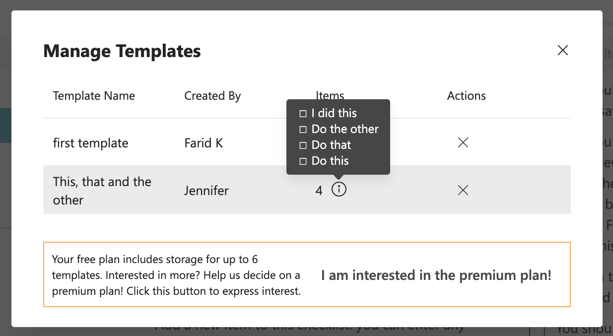 You can have up to 6 templates in this free version of the checklist app. If you are interested in creating more templates, please click on I am interested in the premium plan!
