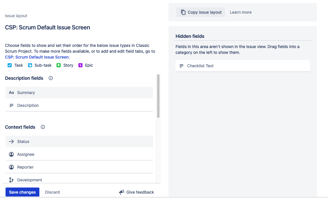 Alternatively, if you want to leave the Checklist Text field visible on the Create work item screen, but not on the View/Edit work items screens, you can configure separate screens for creating and viewing work items.