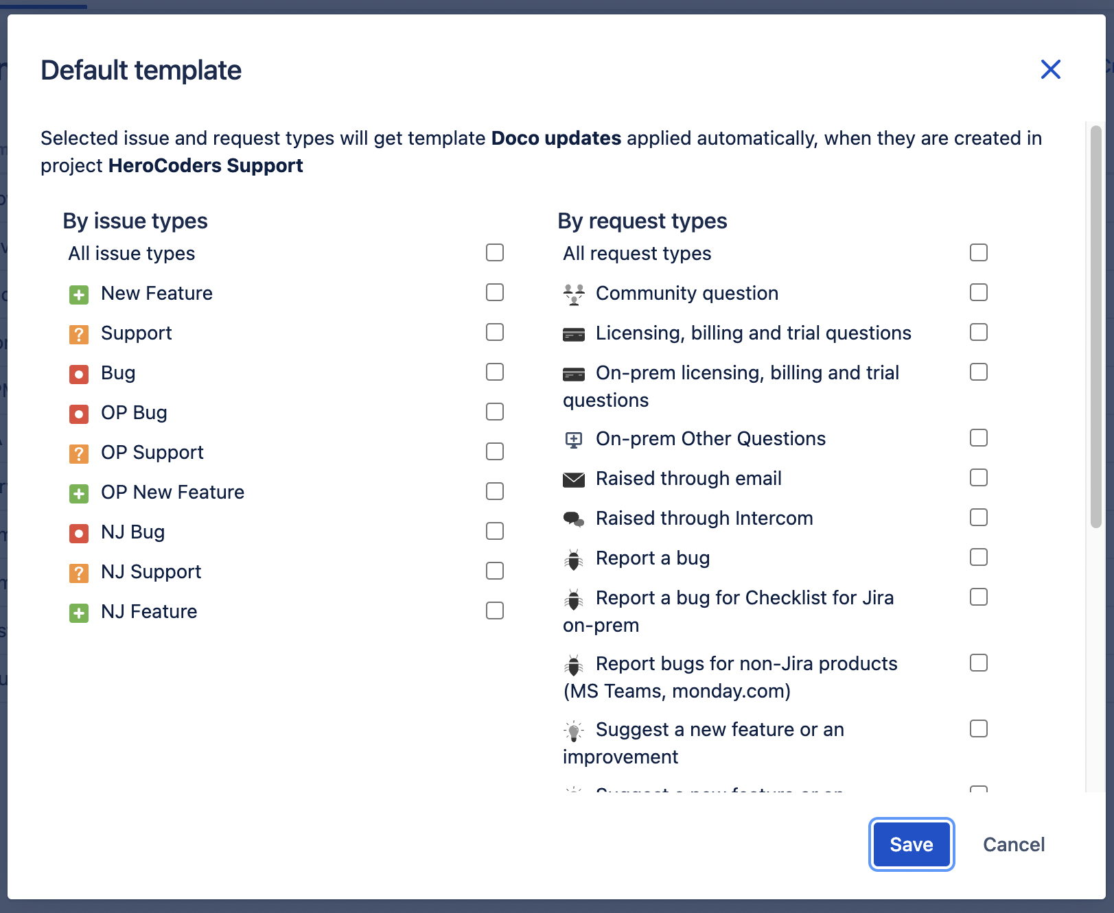 Select the appropriate work item type(s) or request type(s). The checklist will be automatically added when items of this type are created.