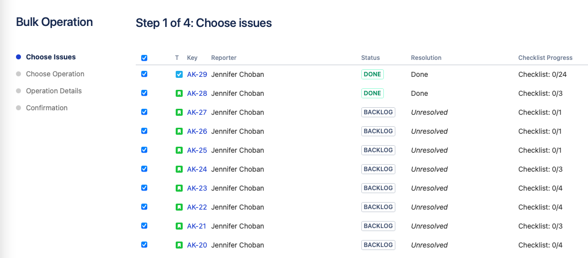 Note that if you have created a default template that is automatically added to issues of a given type in a project, you may want to bulk add the checklist to all issues that were created before the default list was created.
