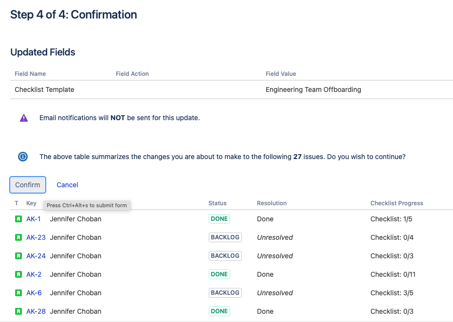 Click Acknowledge when the update is complete. The checklist will have been added to the selected issues.