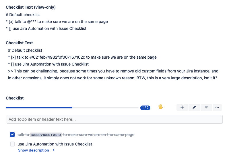 Checklist Text (view-only)A view-only copy of the Checklist Text field without user mentions or item descriptions. The value of this field is automatically kept in sync with the checklist(s) if Sync checklists to Custom Fields option is enabled. The difference between Checklist Text and Checklist Text (view-only) is shown below: ![]() |