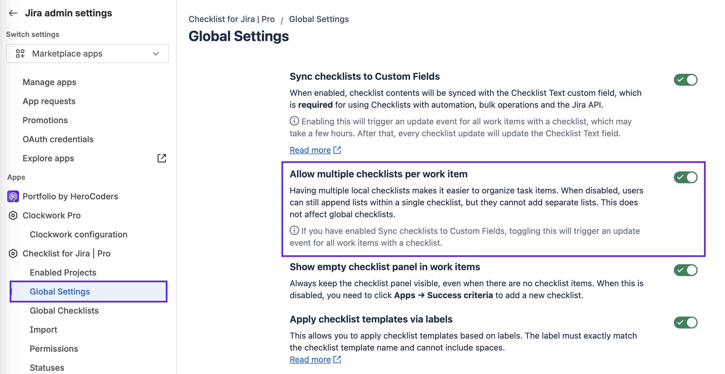 Navigate to Jira settings > Marketplace apps and select Global Settings under the Checklists for Jira heading.
