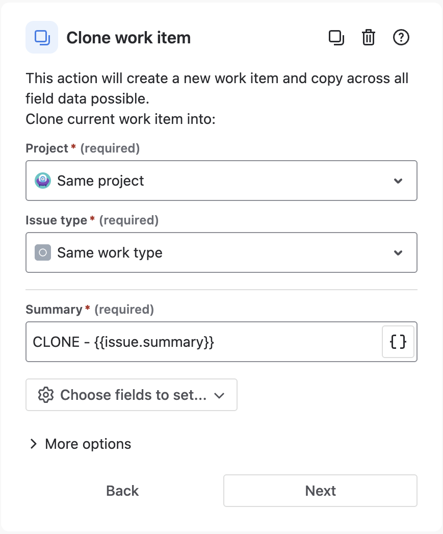 To copy the Jira work item with the all checklist items marked as open/incomplete (regardless of the item status on the source Jira work item), check the Clear Checklist checkbox.