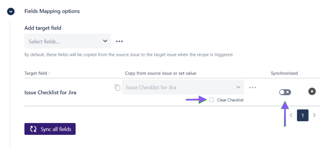 To copy the Jira work item with the all checklist items synced (each time an item is marked as done in the checklist of the source Jira work item, the same item will automatically be marked as done in the checklist of the copied Jira work item) enable the Synchronized toggle.