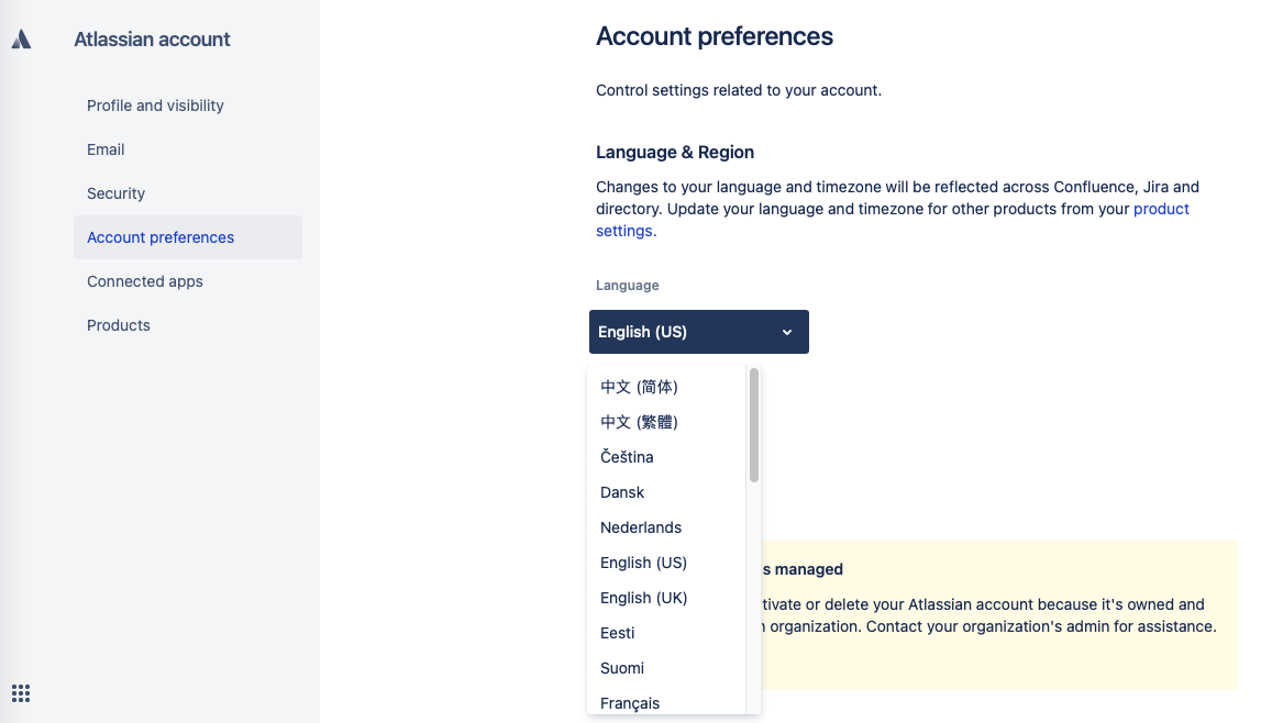 Checklist for Jira is multi-lingual, currently available in English, German, French and Polish (Spanish is coming soon). The language of the Checklist UI is inherited from the user’s Jira preference. Preferences can be set by going to Atlassian account > Account preferences > Language.