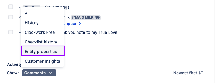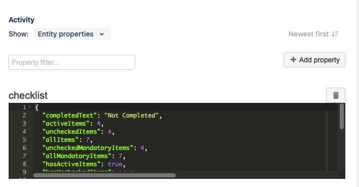 Checklists for Jira sets the entity property checklist JSON object with the following fields/properties inside: