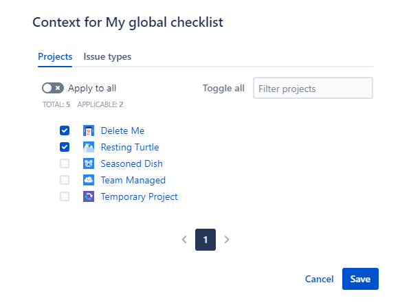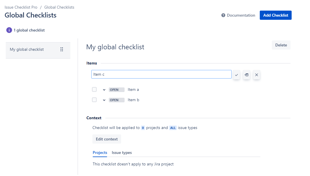 New global checklists are not applied to any project or issue types by default. Click Edit context to configure the projects and issue types you want the checklist to be applied to.