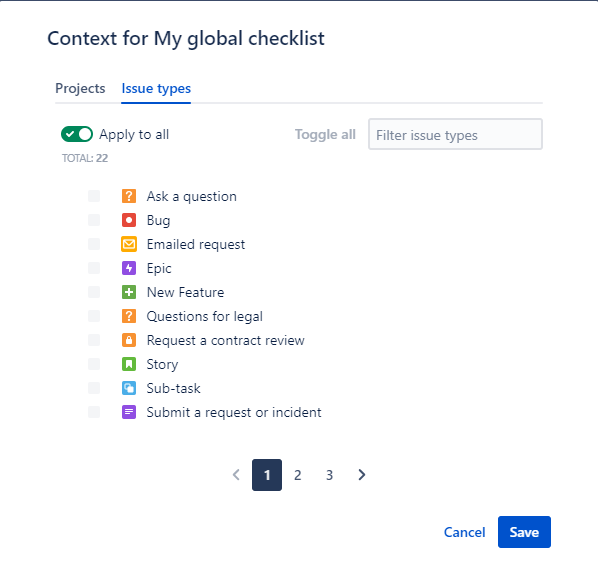 To apply the checklist only to specific issue types, click on the Issue types tab. Switch the Apply to all toggle off and select the indicated issue types.