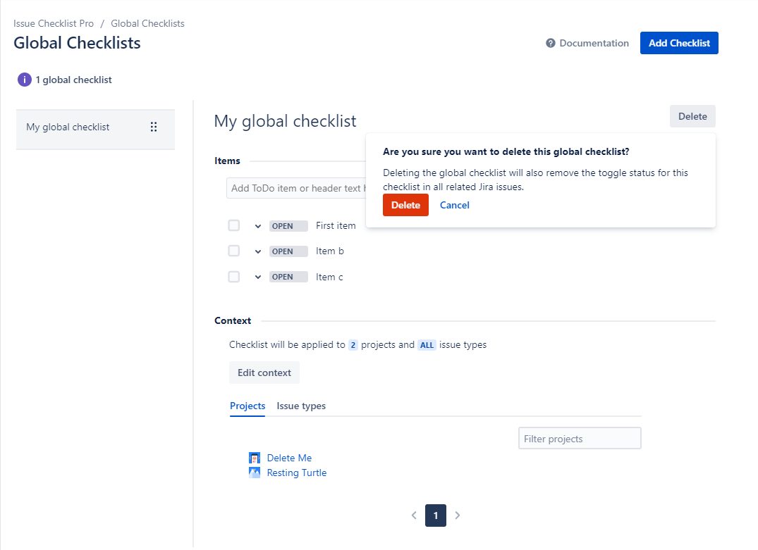 Global Checklists are created and managed at the admin level. They have a Context (similar to a field context in Jira) that defines which projects and issue types the Checklist will be applied to.