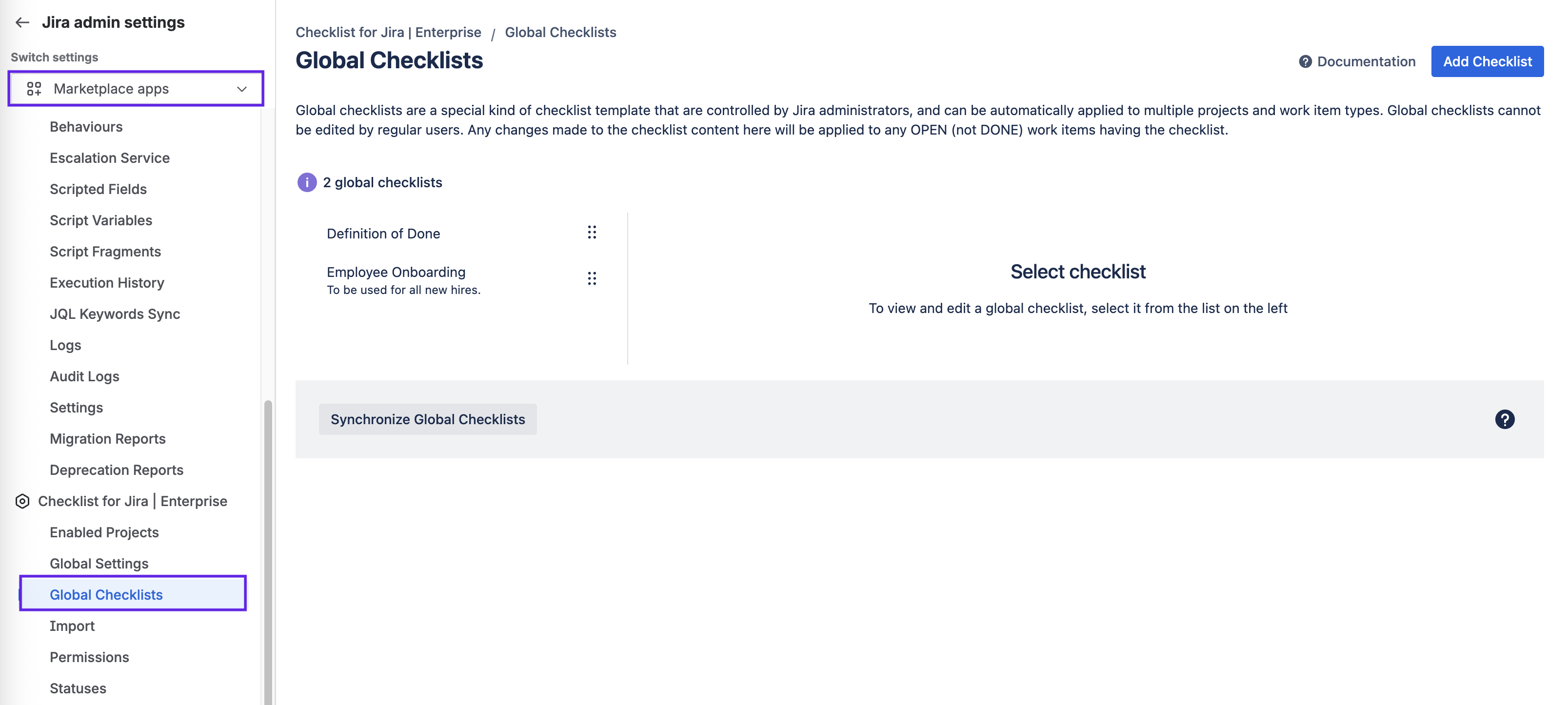 Navigate to Jira Settings > Marketplace apps and select Global Checklists under Checklists for Jira Enterprise.