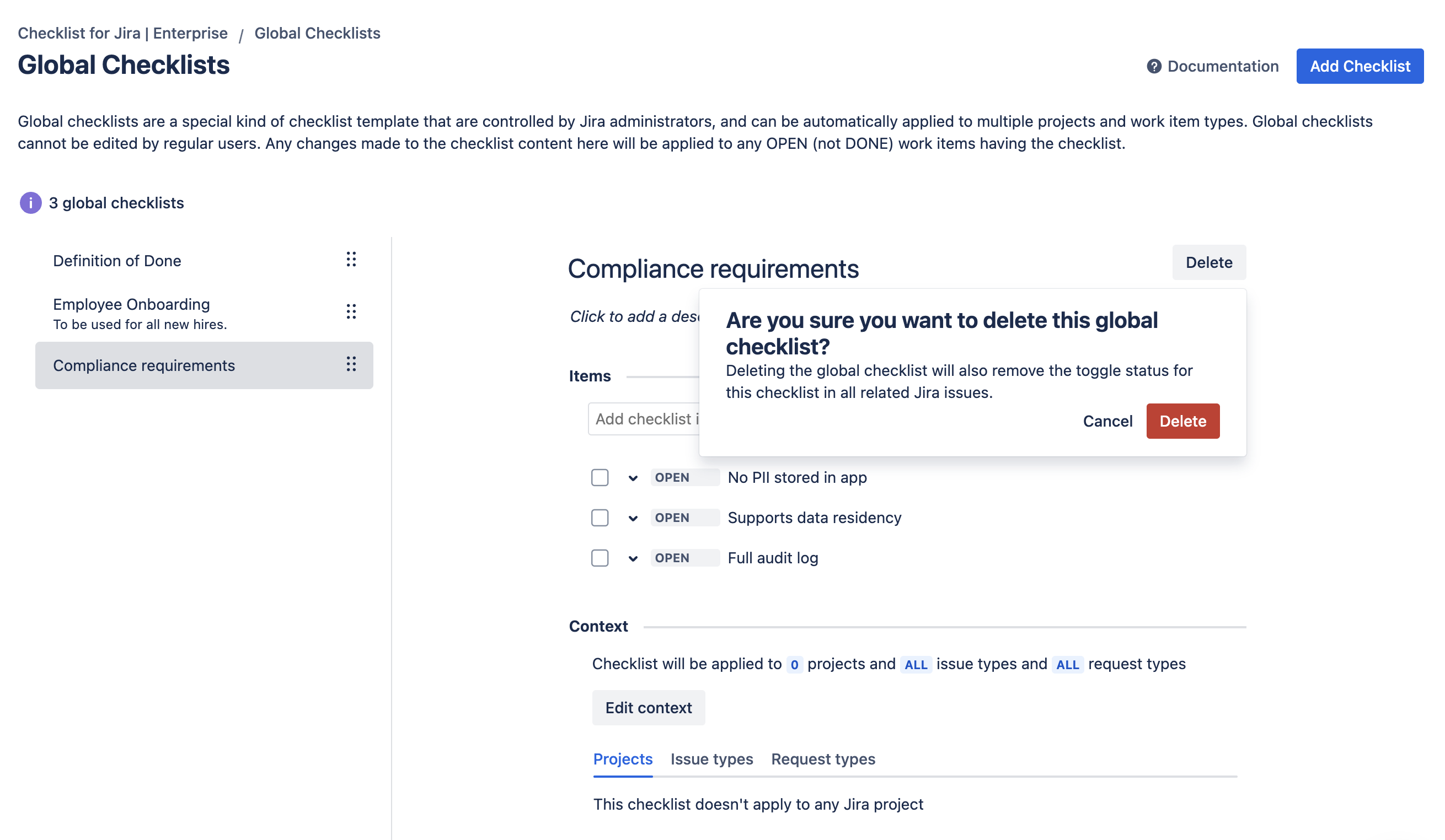 Global checklists are created and managed at the admin level. They have a Context (similar to a custom field context in Jira) that defines which projects and work item types the Checklist will be applied to.