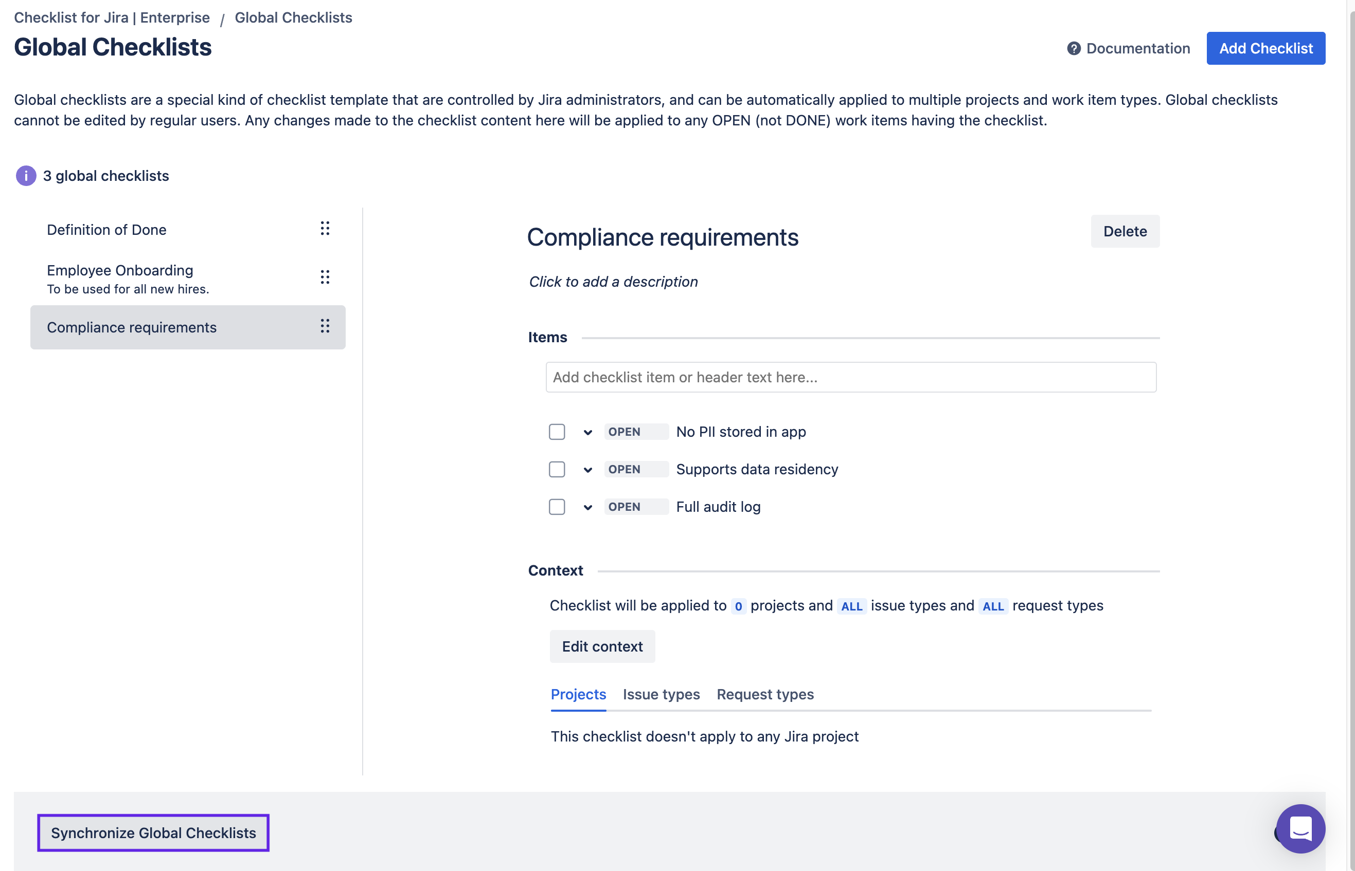 If you used the Enterprise version in the past, then downgraded to Free or Pro, and are now re-installing Enterprise, then a resync will need to be performed. This will allow previously used Global Checklists to be reinstated according to their contexts. Navigate to Jira Settings > Marketplace apps > Global Checklists and click the Synchronize Global Checklists button to resync.