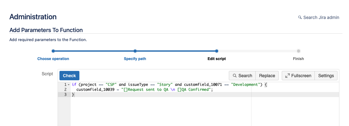 CODEif (project == "DEMO" and issueType == "Story" and customfield_10071 == "Development") { customfield_10039 = "[]Request sent to QA \n []QA Confirmed"; }