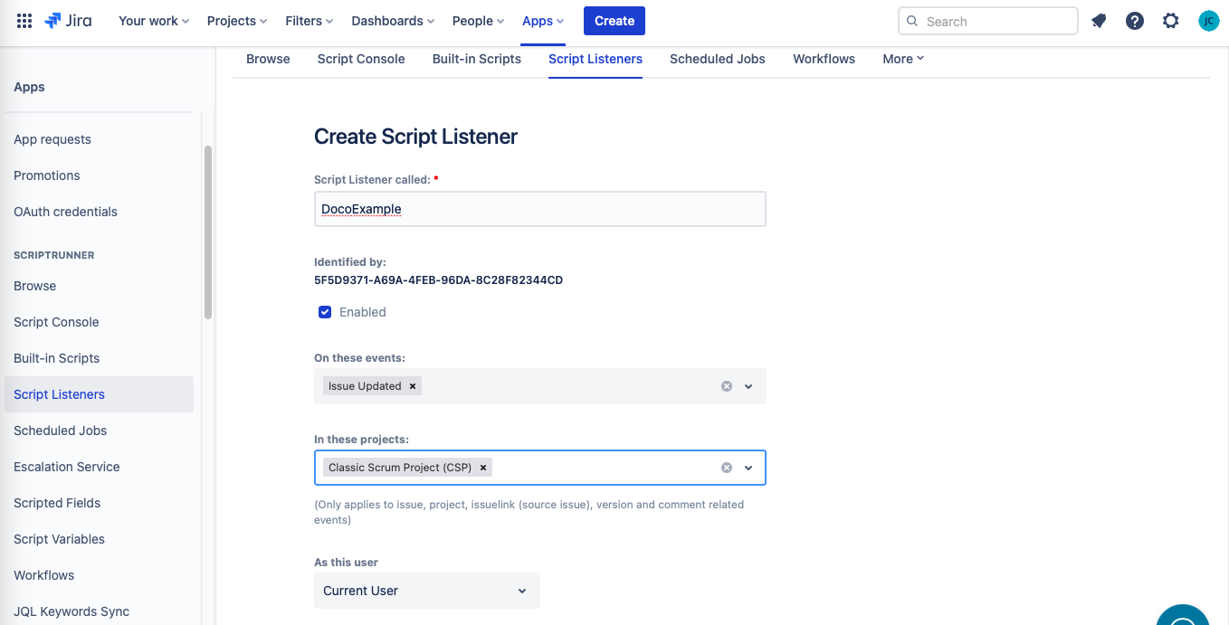 Enter a name of the Listener and select Issue Updated as the event on which the script will be run. Select the relevant space(s).