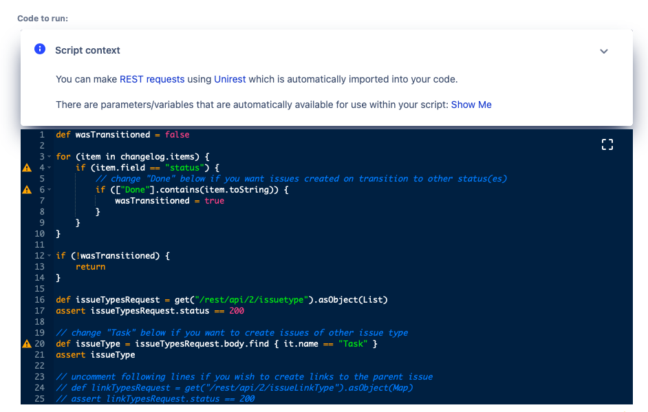 The script ends execution if there was no work item transitioned or if the transition was to a status other than one expected. By default, the script is run when a Jira work item is transitioned to the Done status. You can adjust the script to run when a Jira work item is transitioned to any status in your workflow (line 6).