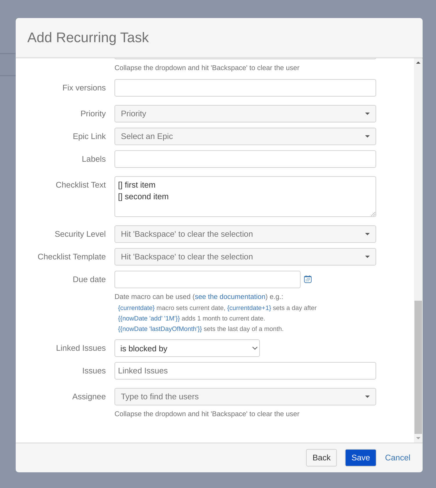 Checklists for Jira can be integrated with Recurring Tasks to create Jira work items that will contain a checklist.