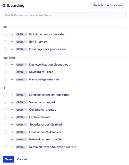As with onboarding, HR, IT and Facilities will each have multiple tasks in order to offboard the employee. However, there is not the same dependency-based order of operations. All three teams will need to prepare their tasks to be executed at the last minute. Therefore, all of the tasks can be listed in the same checklist, with separators to keep the checklist organized.