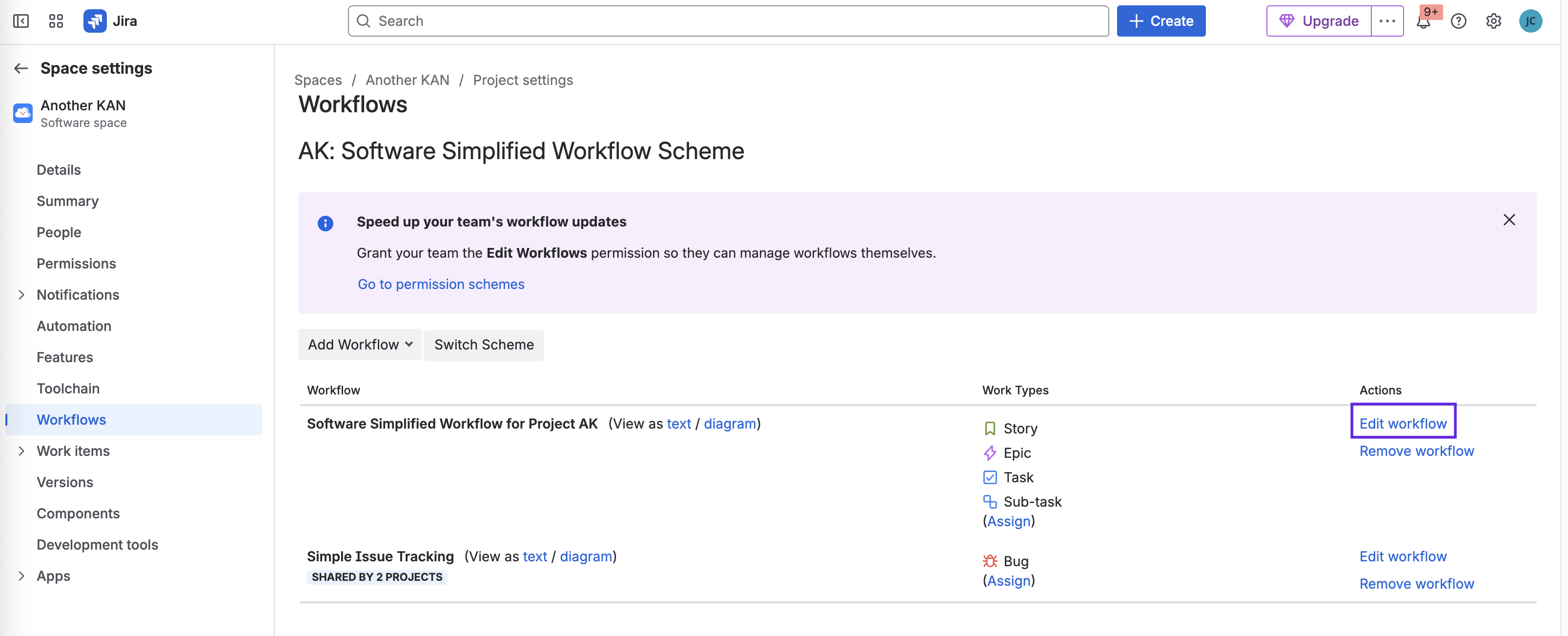 Navigate to Space settings > Workflows and click on Edit workflow.