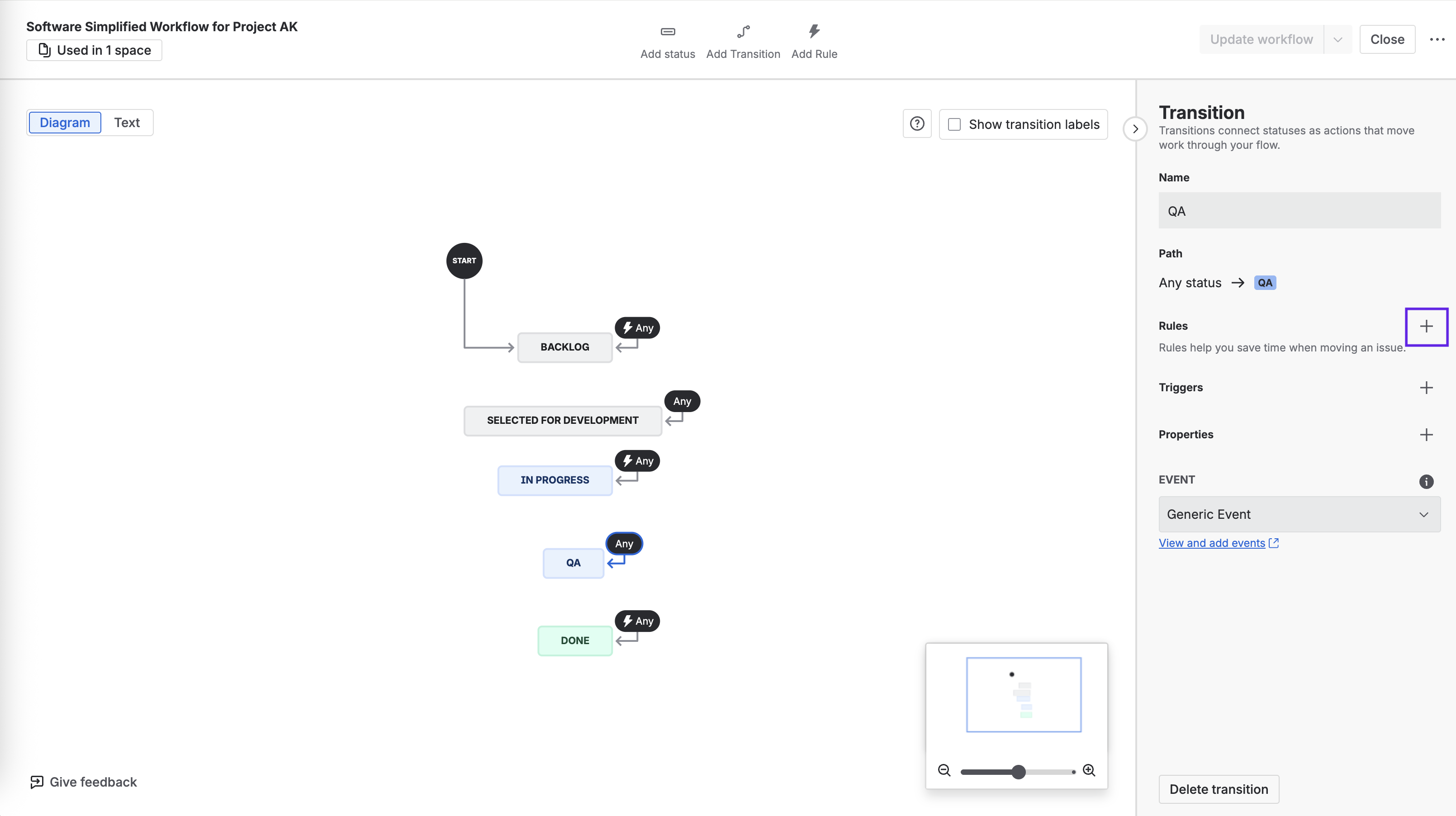 Select the transition where you want to add the rule and click on the Rules + sign.