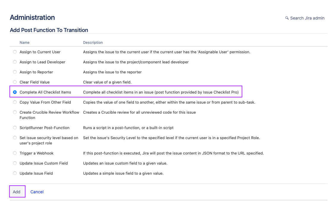 Checklists for Jira provides a post function to automatically mark checklist items as completed on the indicated workflow transition.