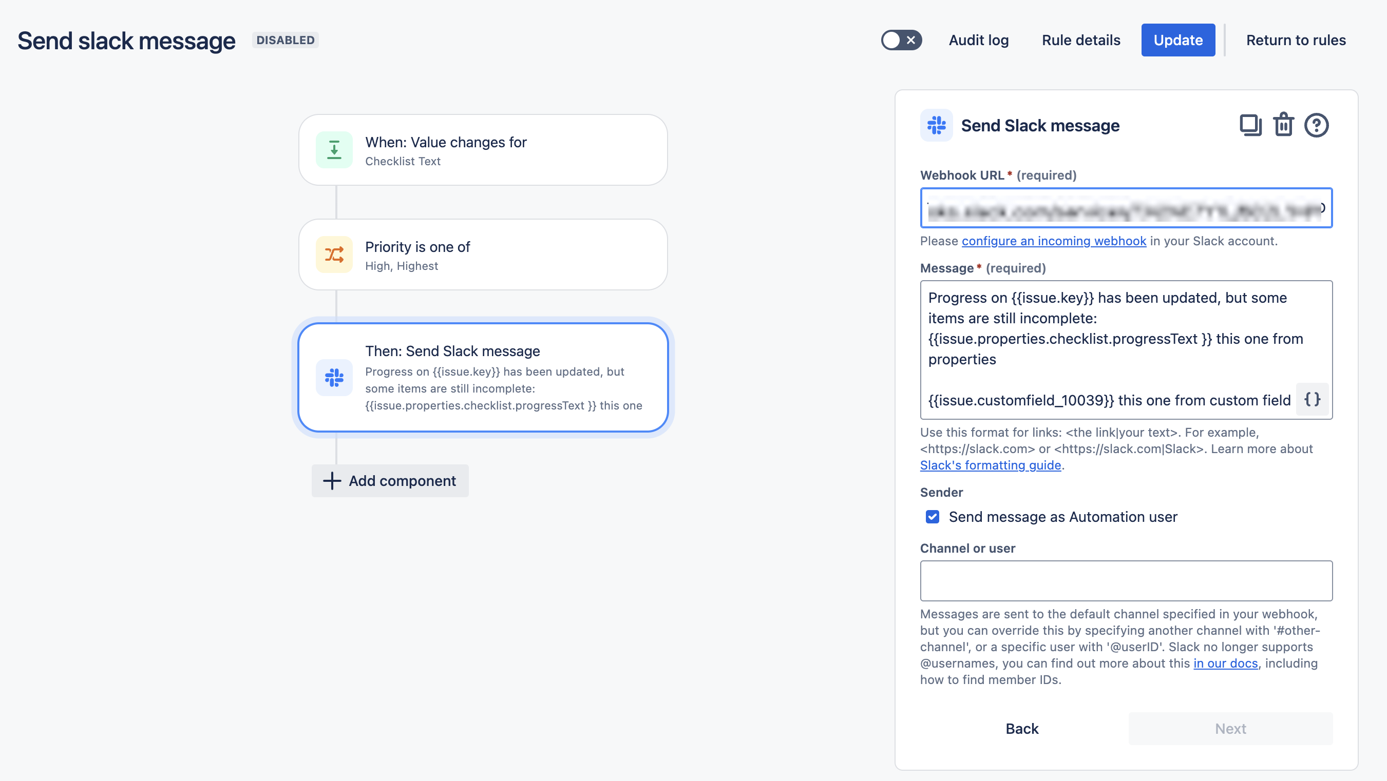 This rule sends a Slack message showing the checklist progress whenever the checklist is updated.
