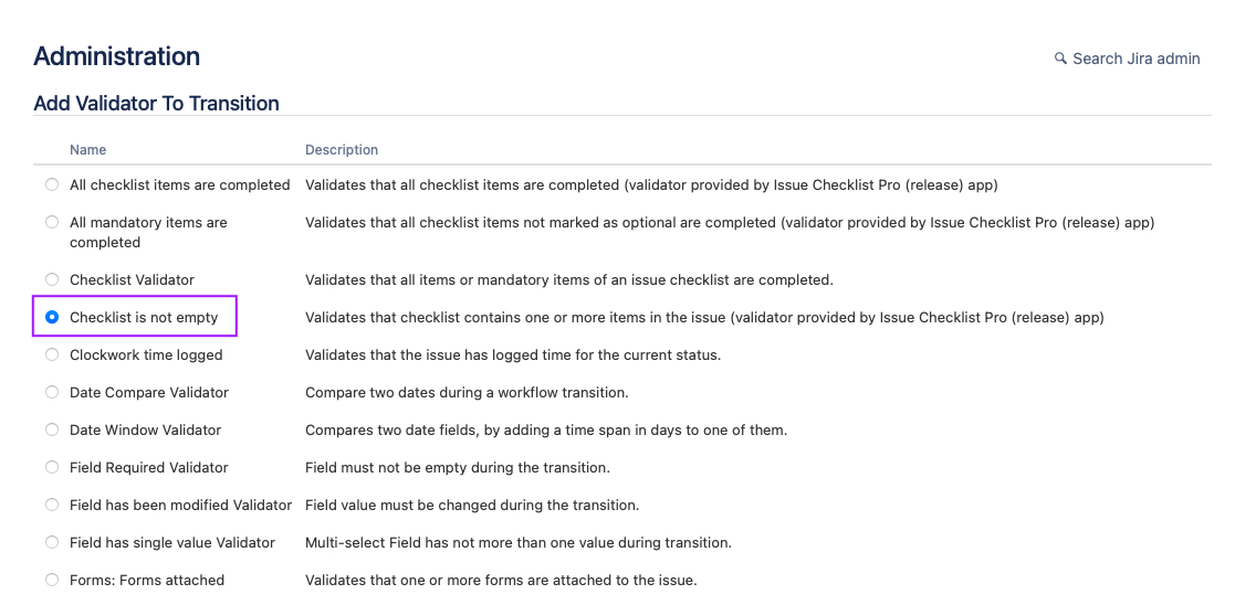 This validator blocks a transition unless there are checklist items, either on a Local or Global Checklist.