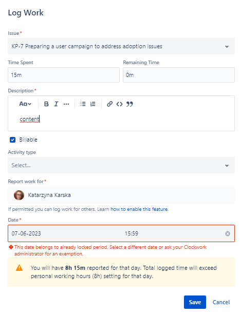 When a user tries to add, edit or delete a worklog within the locked Billing Period, the action will be blocked and they will be notified that the Billing Period is locked.