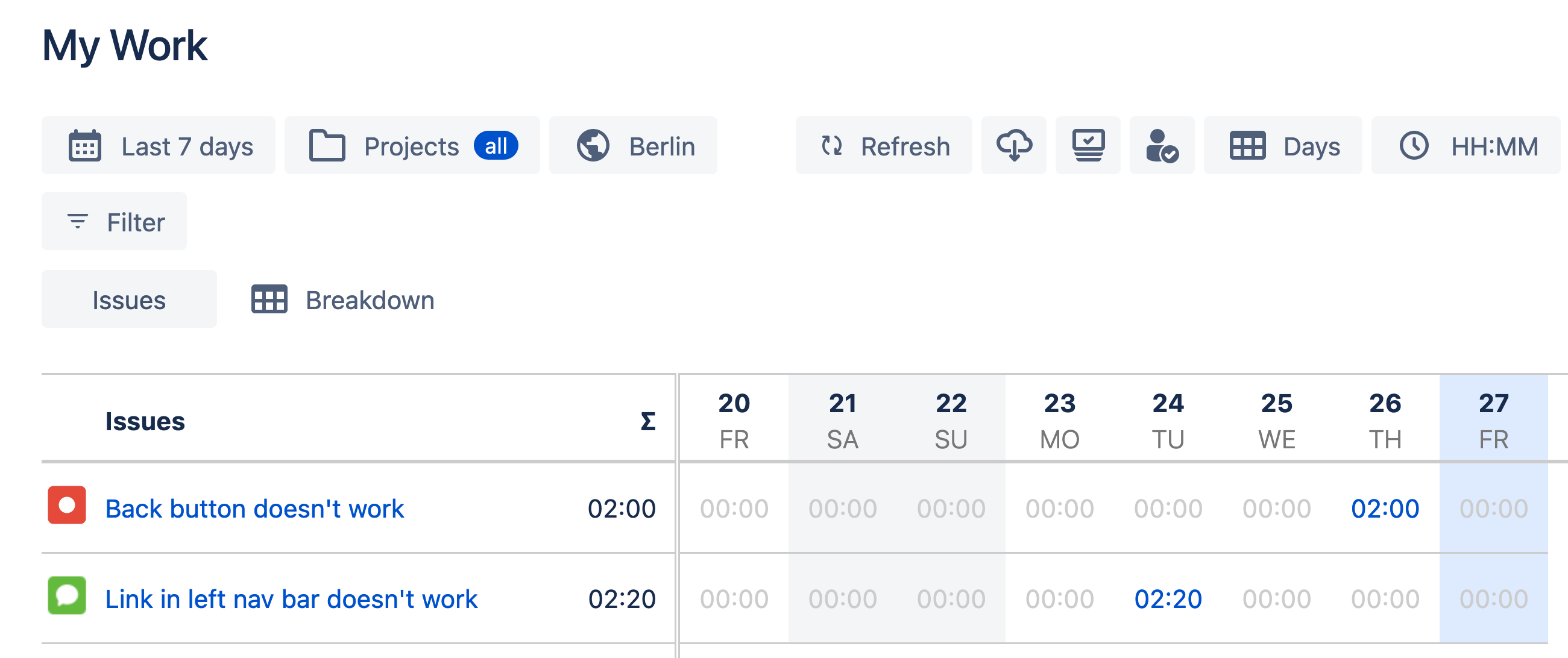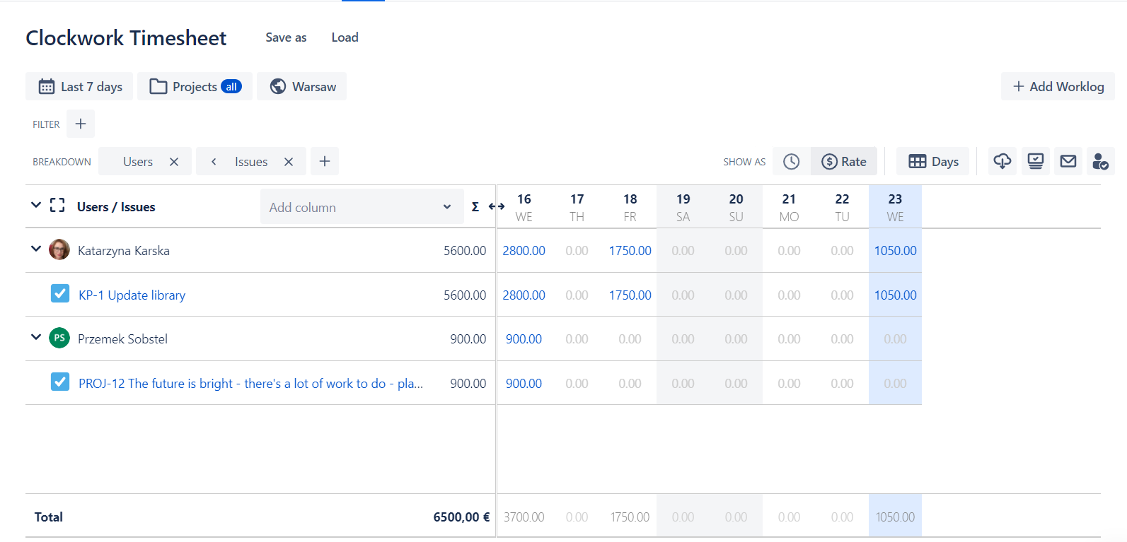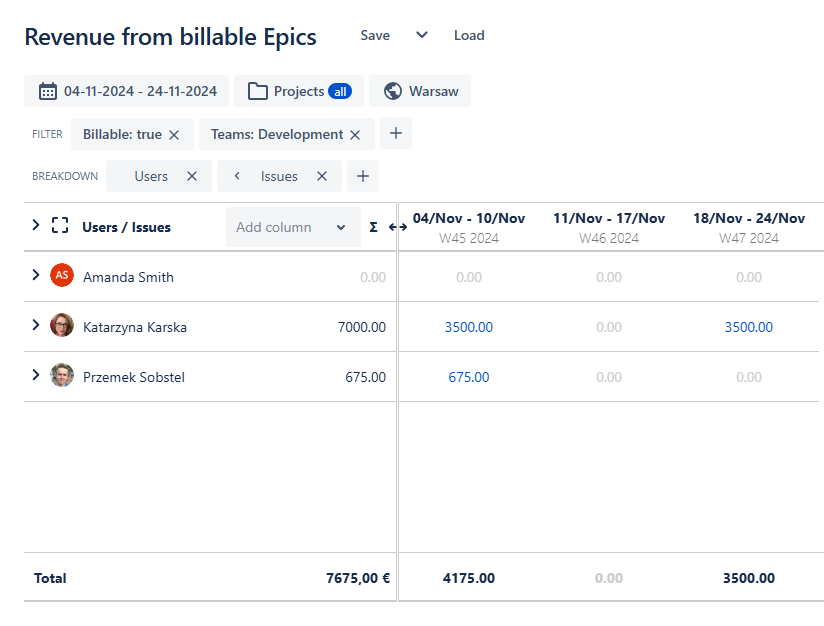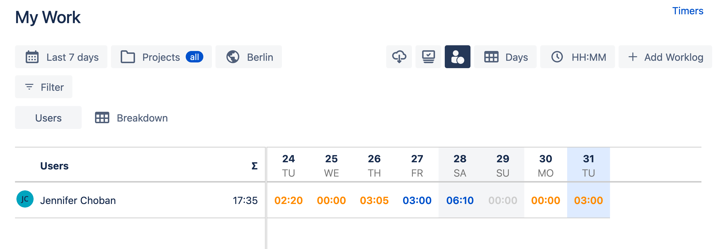 You can filter or breakdown your timesheets by multiple factors including spaces, users, teams, epics, work item types, custom fields, versions, custom worklog attributes and many others.