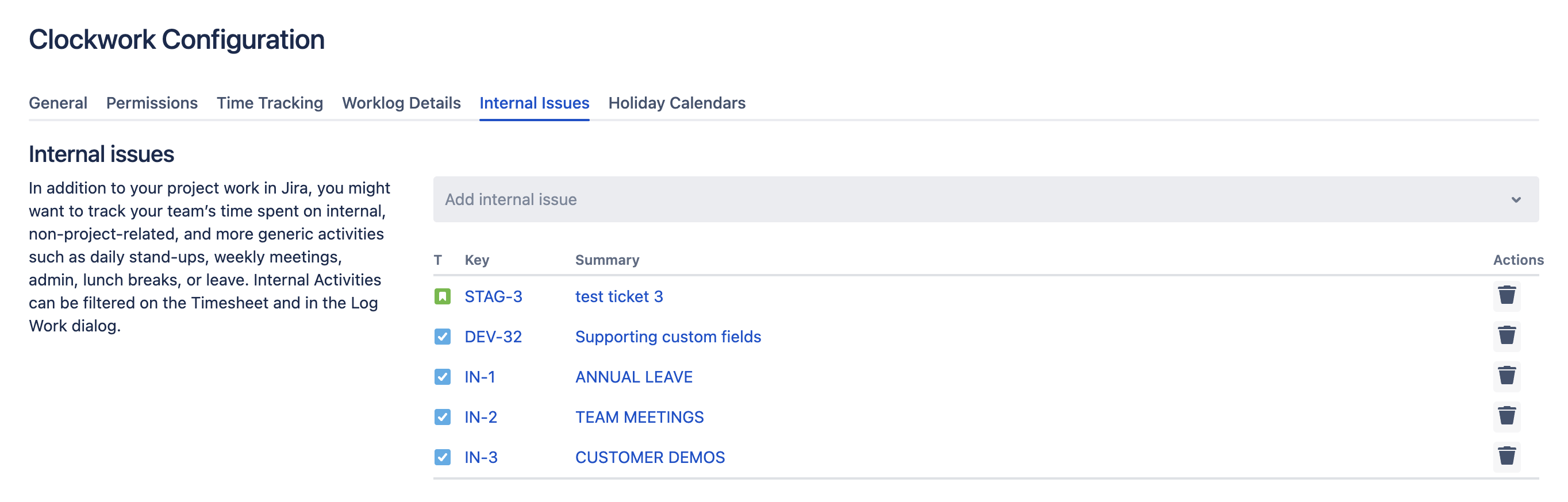 Track your team’s time spent on internal, more generic activities such as daily stand-ups, weekly meetings, admin, lunch breaks, or leave. Internal Activities in Clockwork can be filtered for on the Timesheet and in the Log Work dialog.