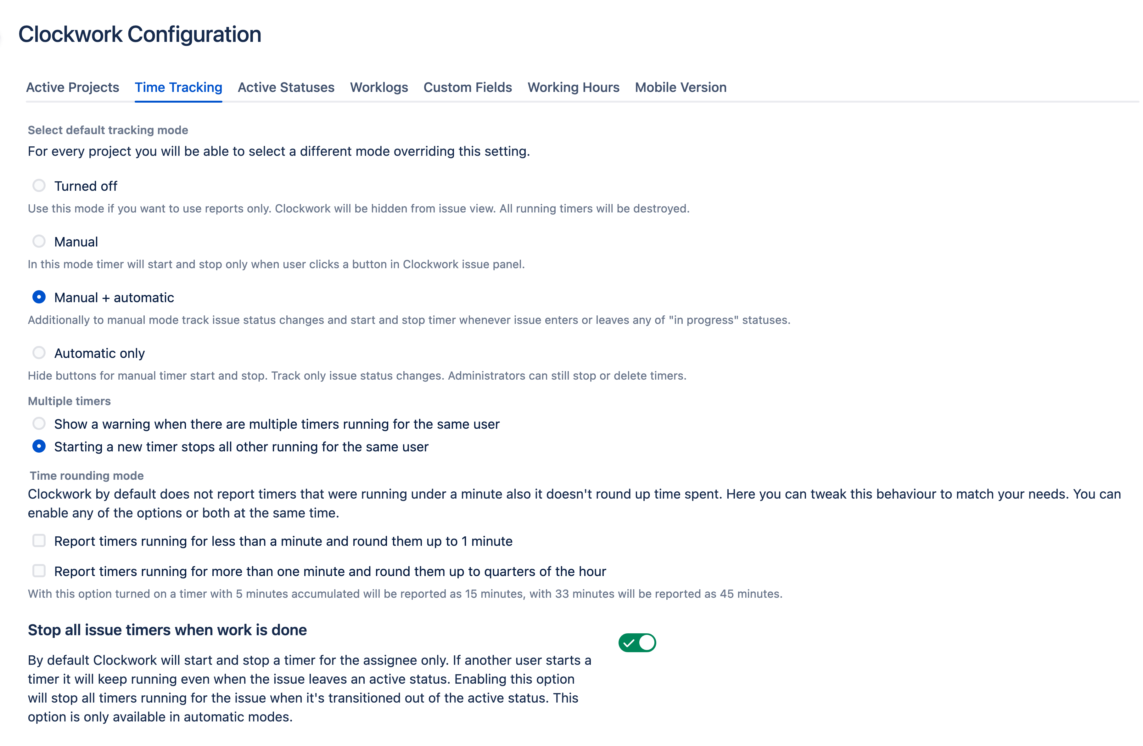 Set automatic timers that run whenever a work item with an assignee is in an Active status or allow users to start and stop timers on a Jira work item manually. Clockwork Pro allows you to use an unlimited number of timers. The Lite version has timers limited to 300 per month.