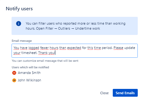 Use the Outliers filters to look for team members who didn’t log the expected amount of time and send them a quick email reminder to update their timesheet.