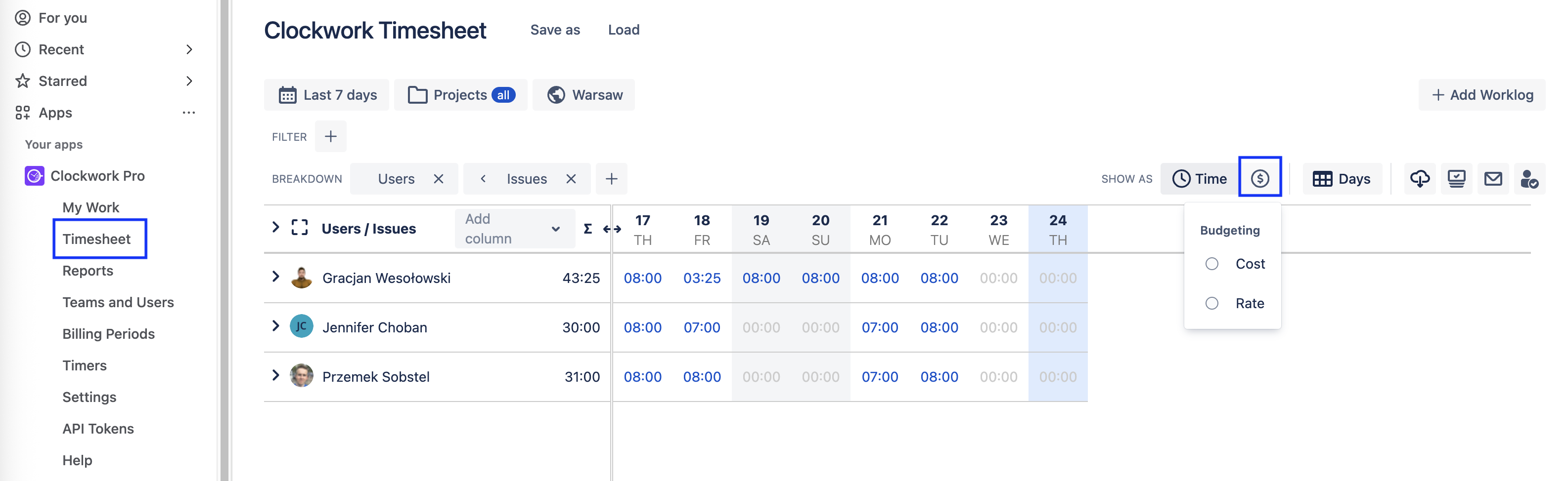 To define and see costs and rates, a user needs to be in a group with the Clockwork Budgeting Access global permission. Only users with this permission can access Clockwork costs, rates, and revenue reports.