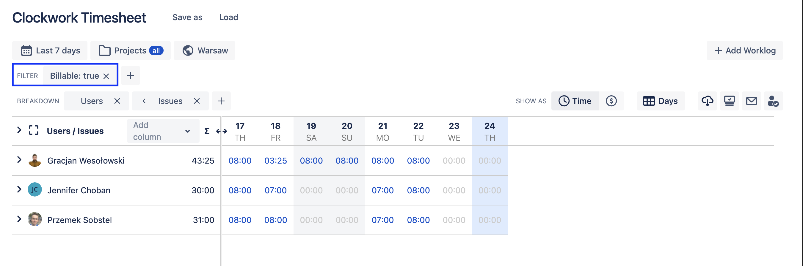 To see only the cost/rates for billable hours, use the respective filters depending on how you mark your work as billable (custom field or worklog attribute. )