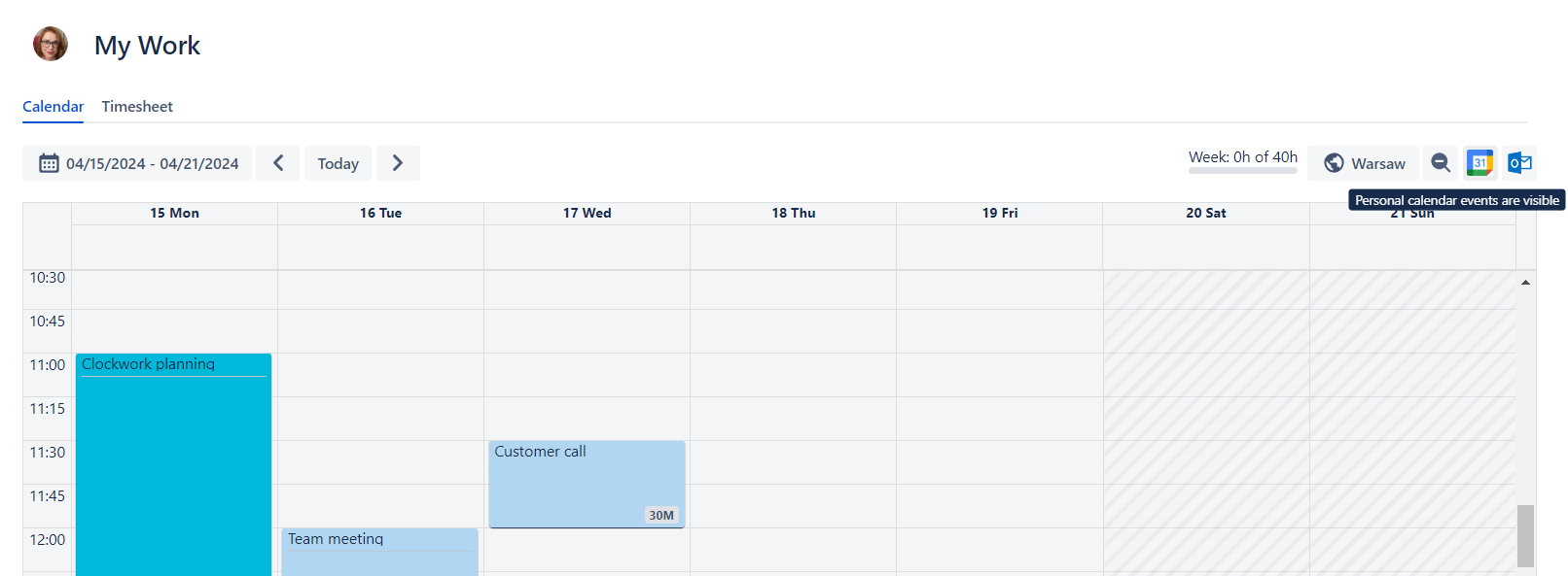 You can integrate your Google Calendar with Clockwork to show scheduled events on the calendar view of your Clockwork timesheet.