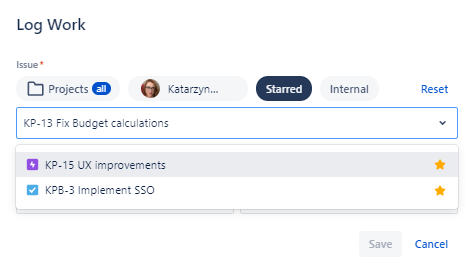 Now, every time you just click on the Starred filter in the worklog dialog in every Clockwork view (Work item, Timesheet, Calendar), you’ll be able to select a work item from your starred items.