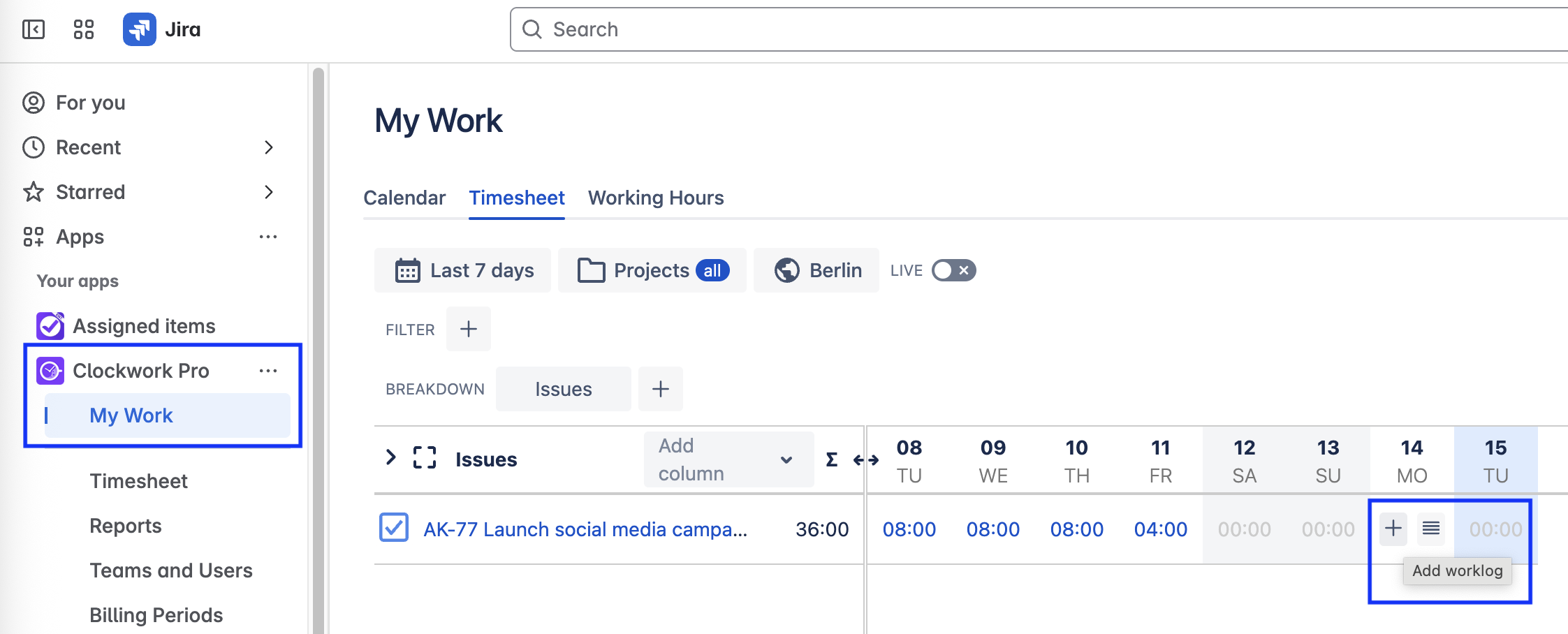 Navigate to Apps > Clockwork > My Work > Timesheet.