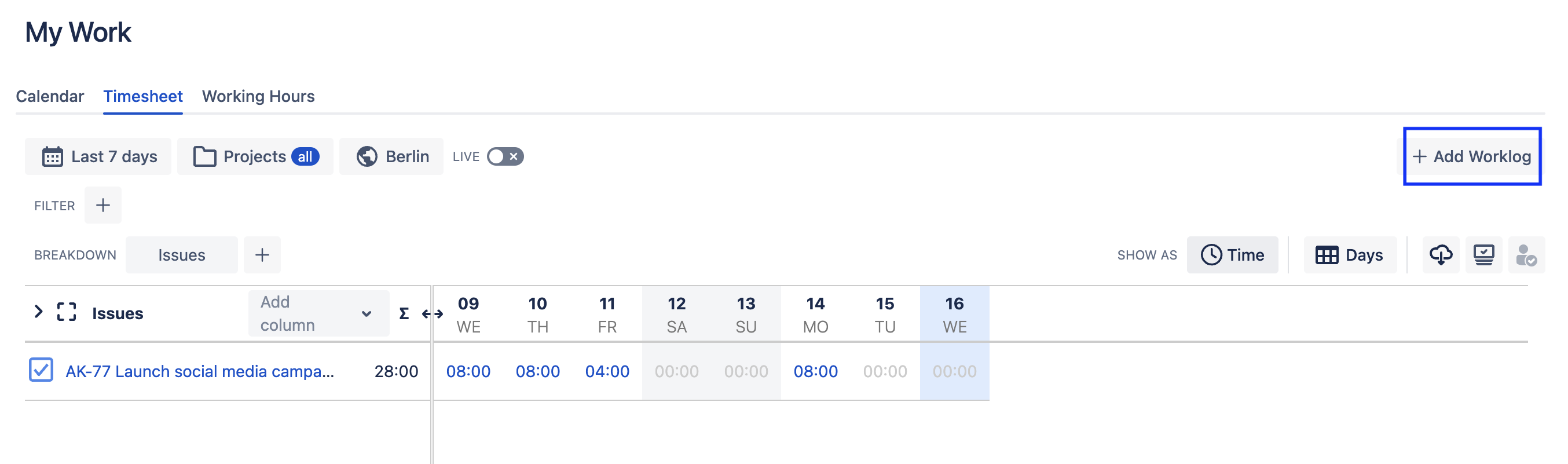 Creating Worklogs from the Timesheet