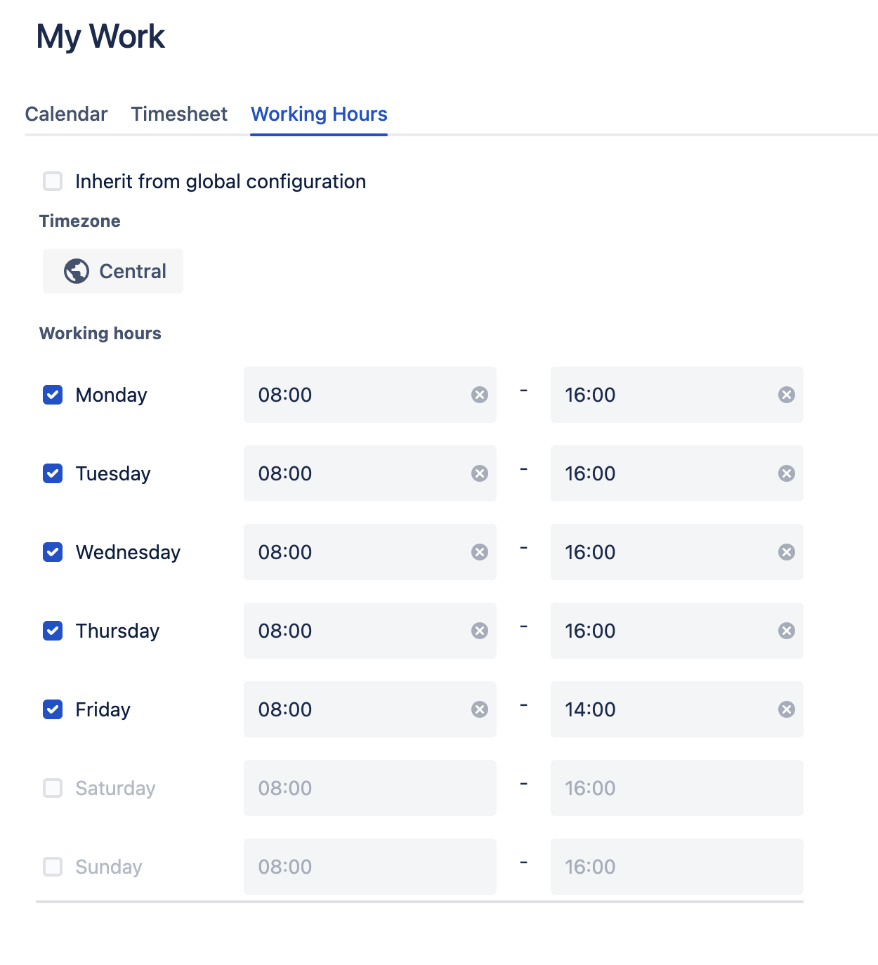 While Working Hours shows a specific start and end time, Clockwork recognizes that different users have different schedules. (A user can configure their own Working Hours, by going to Apps > Clockwork in the main Jira menu and selecting Working Hours tab on My Work). Clockwork will assume the user’s normal start time based log entries and use the number of hours allowable in a work day (from the Working Hours) to detect overnight and over-the-weekend time. The overnight and over-the-weekend time will be subtracted from the total time logged to calculate the Time Spent. The total reported time will be split among days worked with one Jira worklog entry for each day.