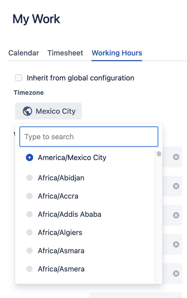 The global setting (Jira settings > Apps > Clockwork configuration > General > Timezone & working hours) allows you to select the timezone (this will override the Jira setting) and working hours for your organization.