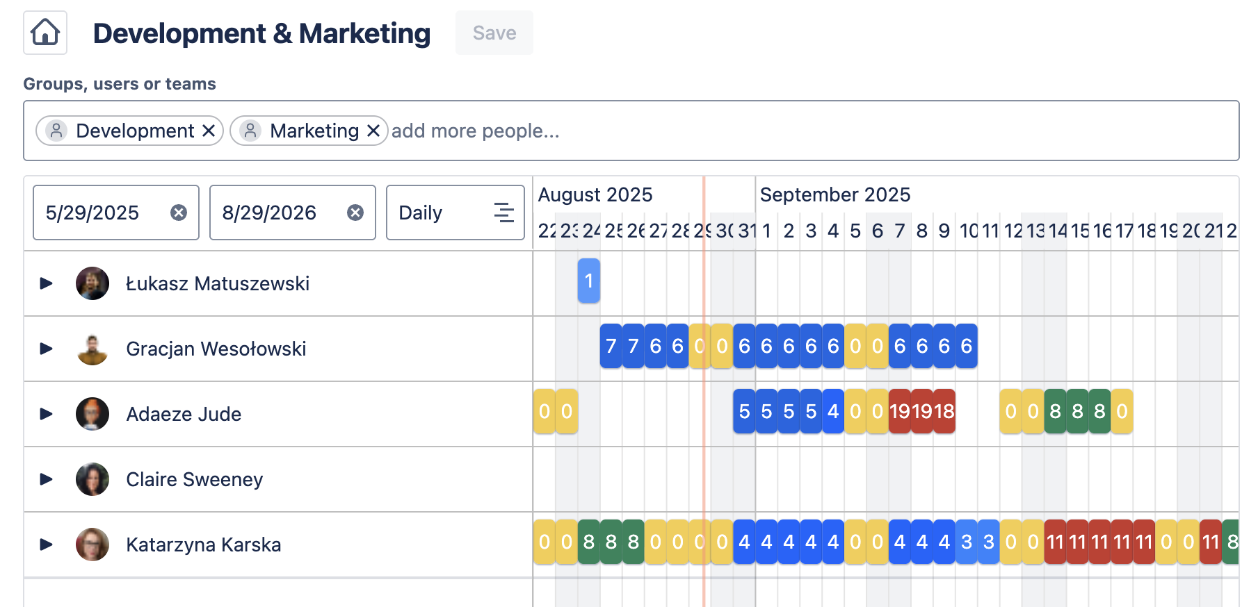 You can zoom in or out on your view of your team’s capacity by changing the time increment of the capacity planner (Daily, Weekly, Monthly):