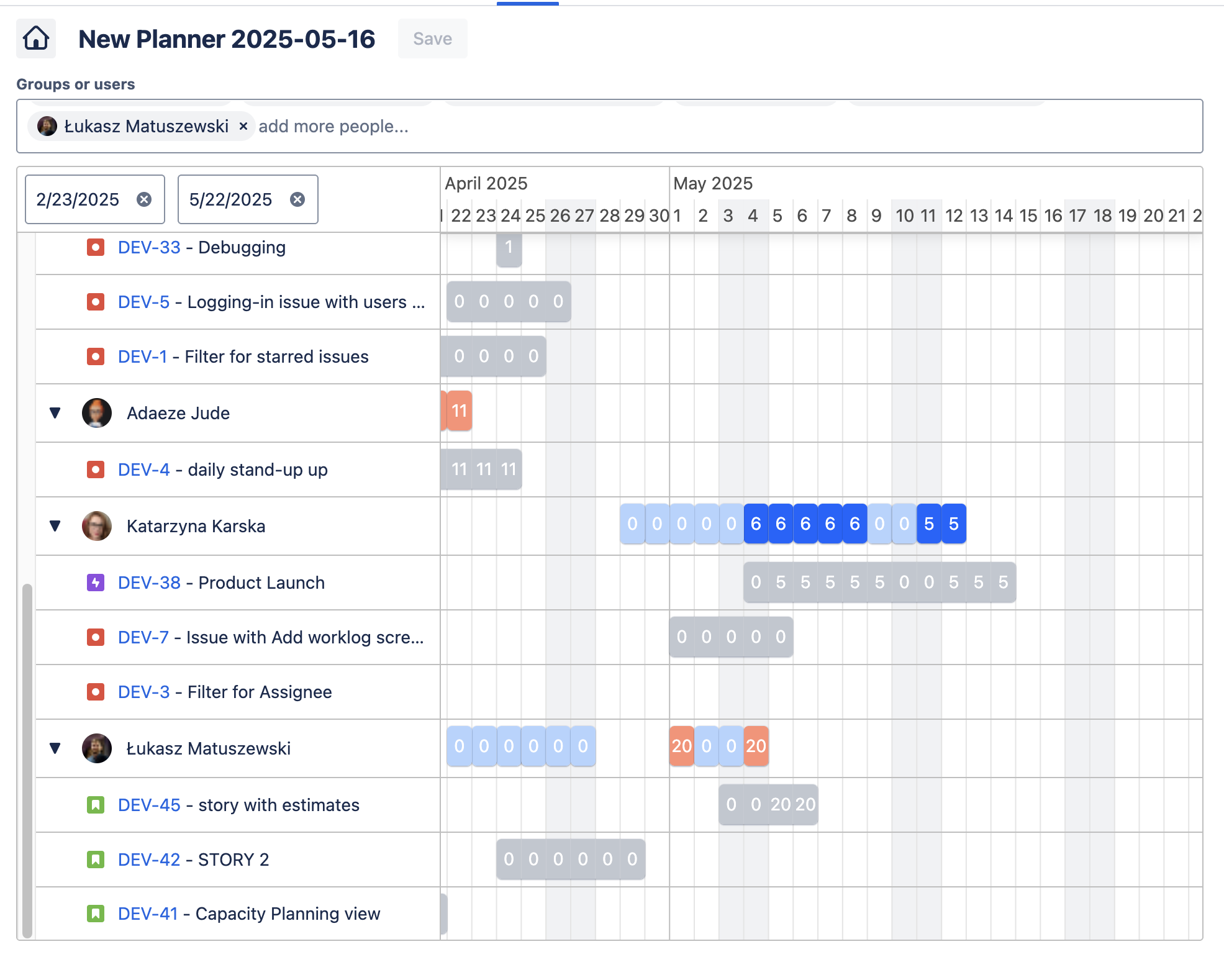 Add Unplanned Items to Team Members’s WorkloadDrag Jira work items from the “Unplanned” panel to instantly assign them to a team member. | ![]() |