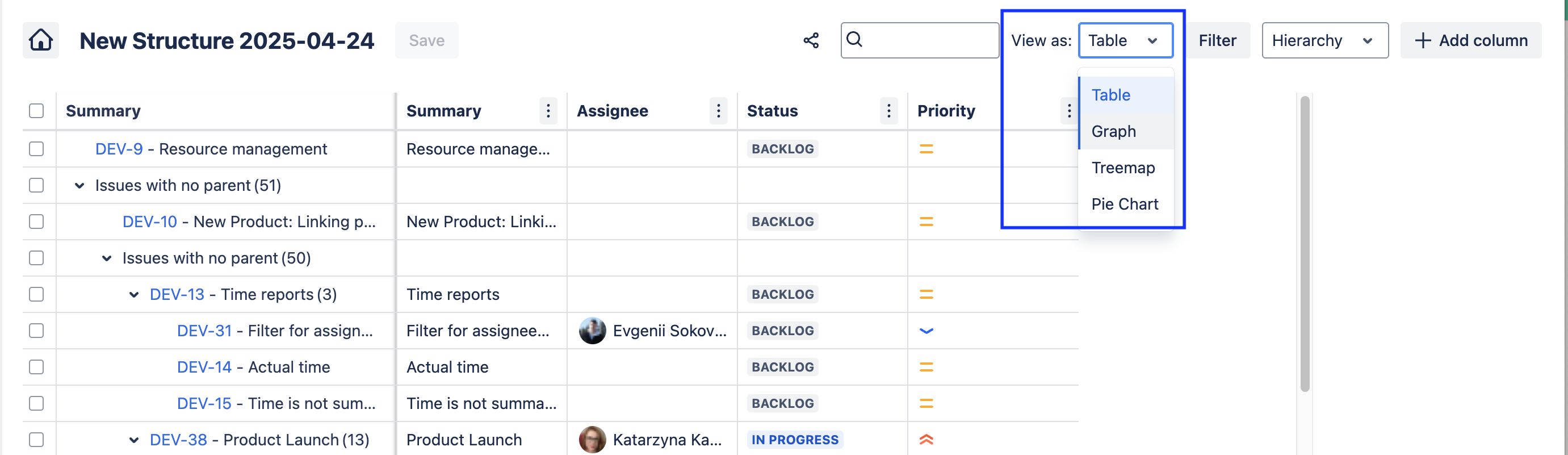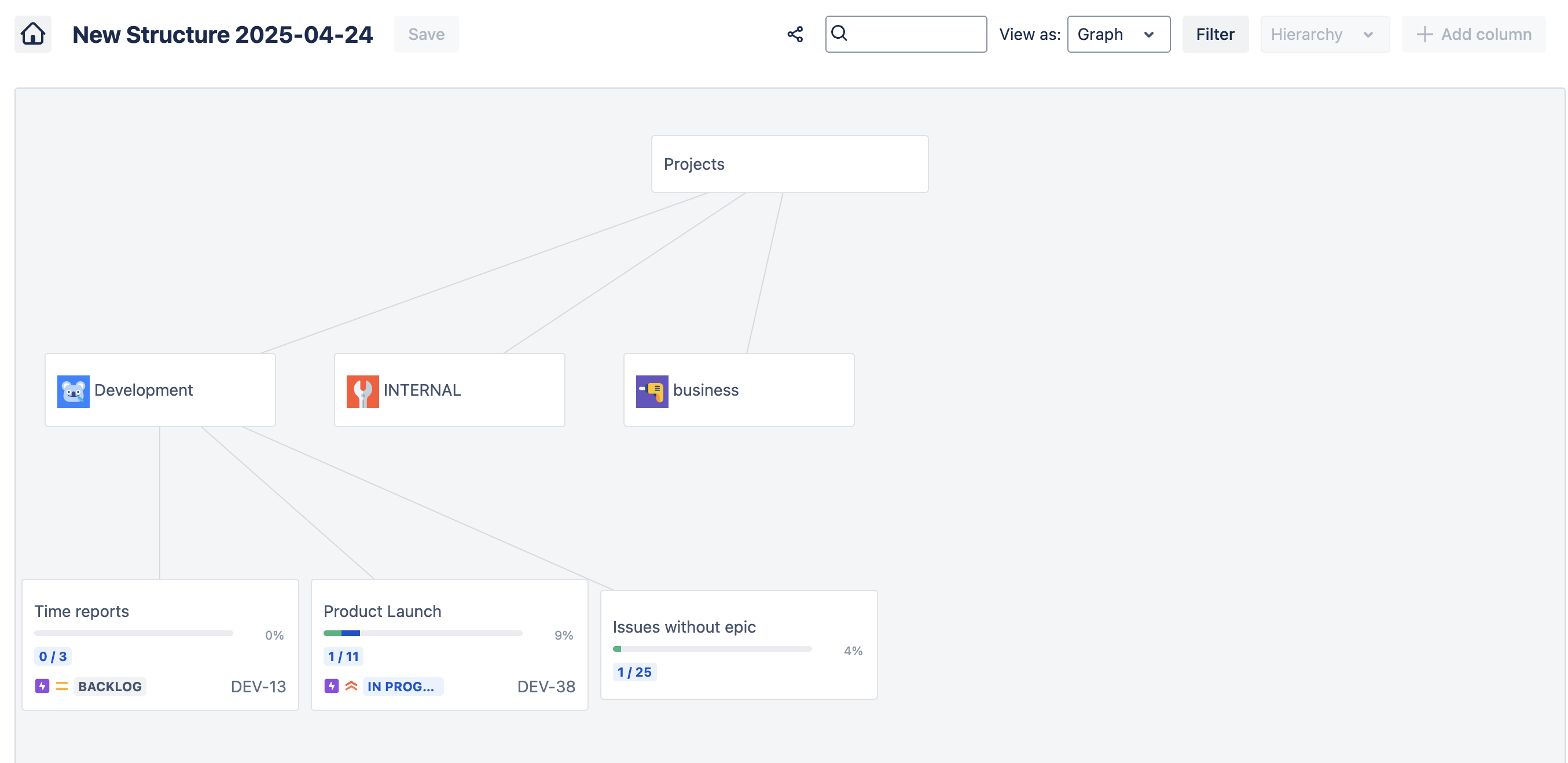 Graph view makes it easy to see work items and their relative place in the hierarchy (including custom hierarchies available in Jira Premium and Enterprise).