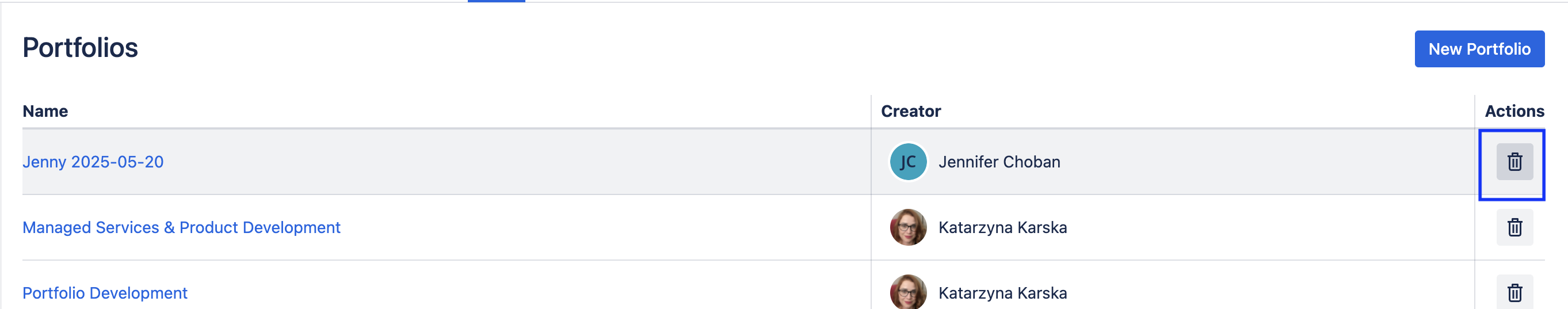 Select the appropriate portfolio and click on the Trash icon to the right.