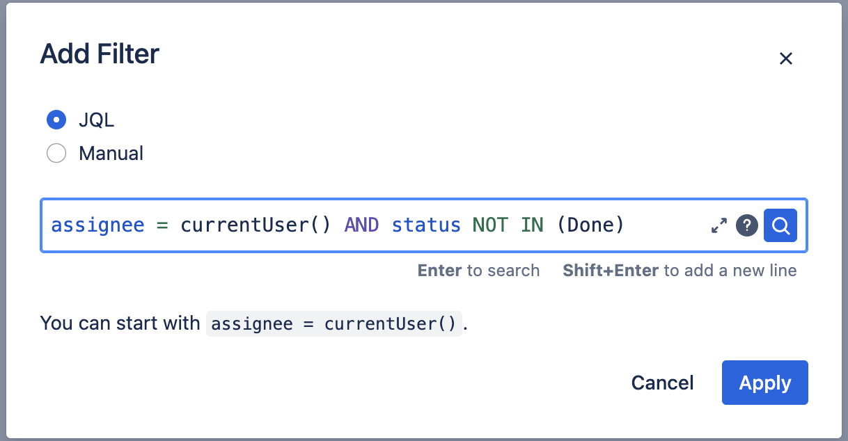 Enter the JQL query.