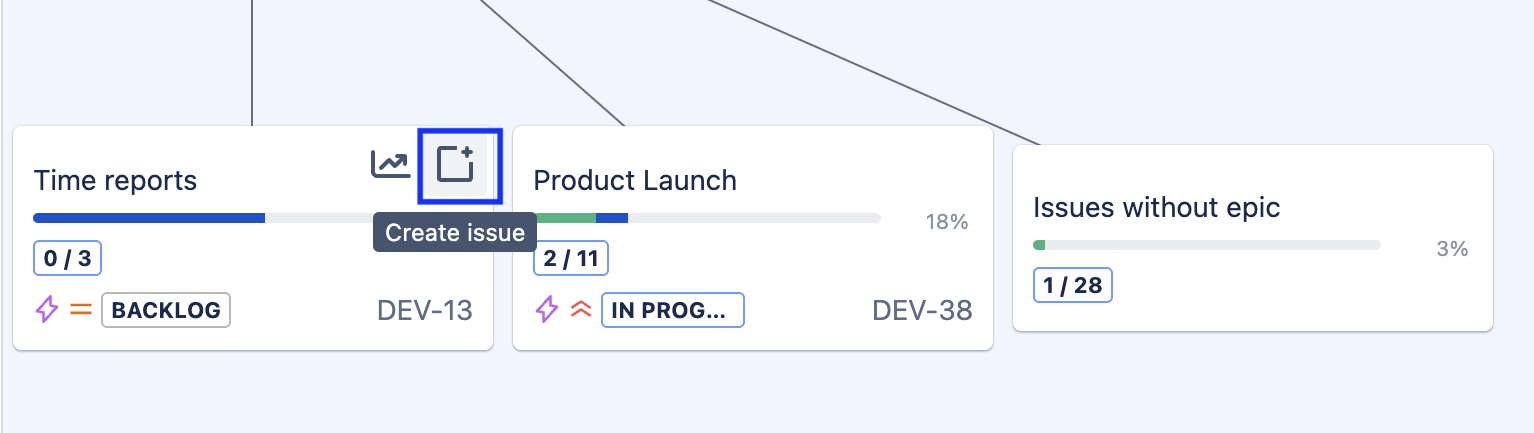 When you notice gaps, you can create new Jira work items directly from your portfolio. Click on the square with a + icon to create a new work item. If you are clicking from a parent work item, the create work item screen will open with the Parent field already populated.