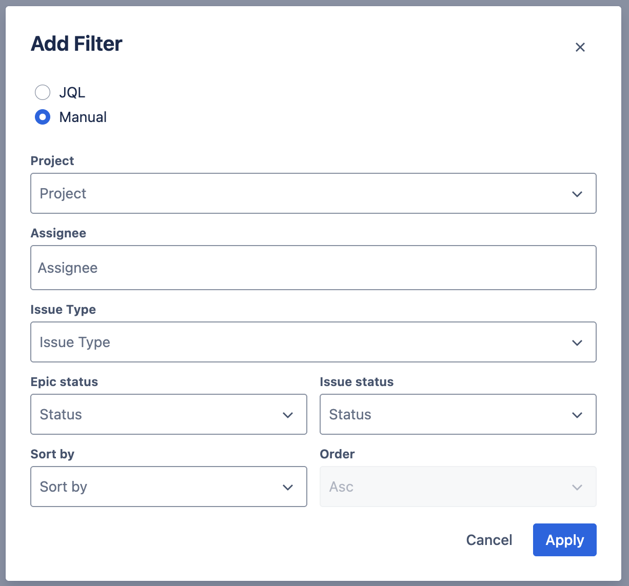 You can define the parameters of your Portfolio using a JQL query, or by manually entering elements in the dialogue box.