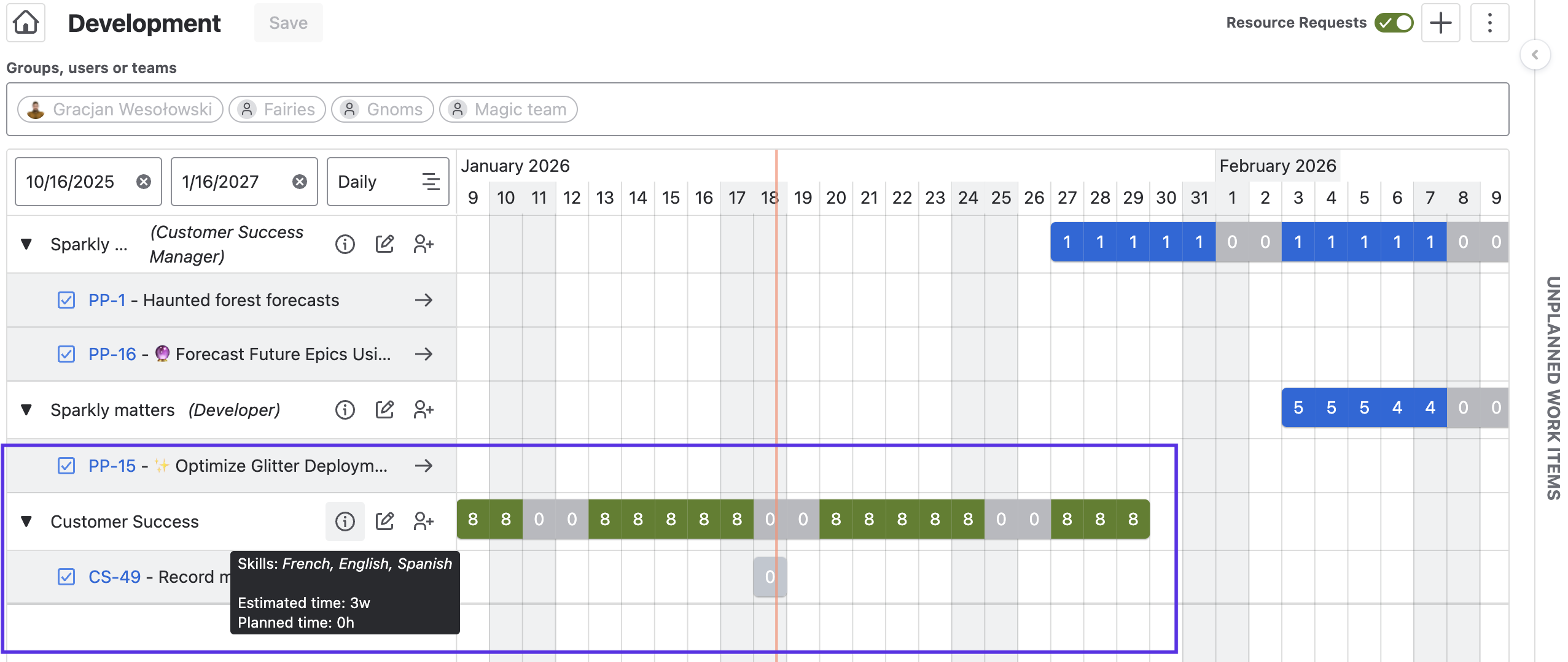 The ADVANCED EDITION of Portfolio allows you to create resource requests to plan for future demand, ensuring that team members with the appropriate roles and skills are available when needed.