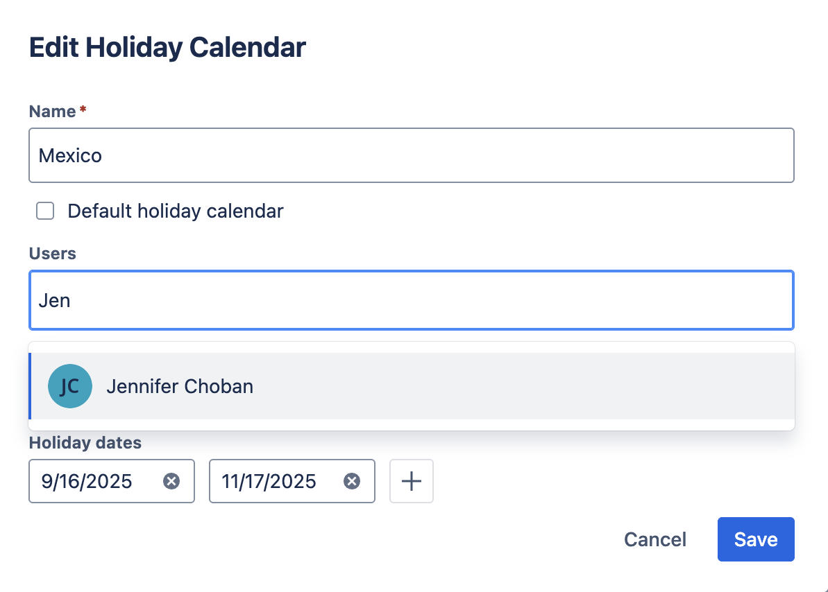 Jira admins can edit a Holiday Calendar to add holidays, set the Calendar as the default or assign users to the Calendar.
